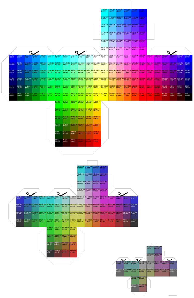 Do you know the colour cube? It represents the 216 colours implemented on the computers with limited colour space. I created a 3-dimension model that you can print as a GIF image (80Kb) and assemble with glue and scissors.