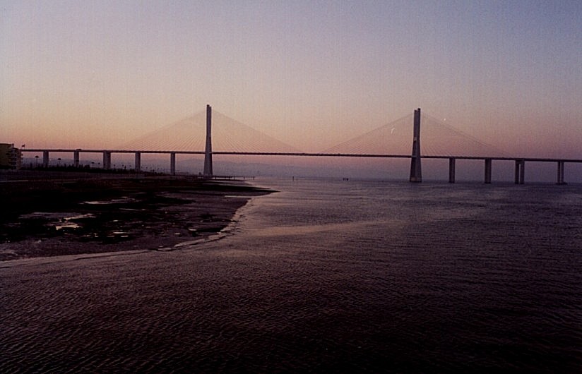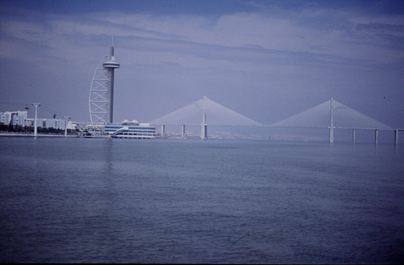 The bridge and the Vasco da Gama tower viewed from the river. (enhanced copy: 63Kb)